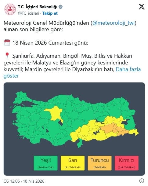 Meteoroloji Genel Müdürlüğü’nden alınan son bilgilere nazaran; 18 Nisan 2026 Cumartesi günü;