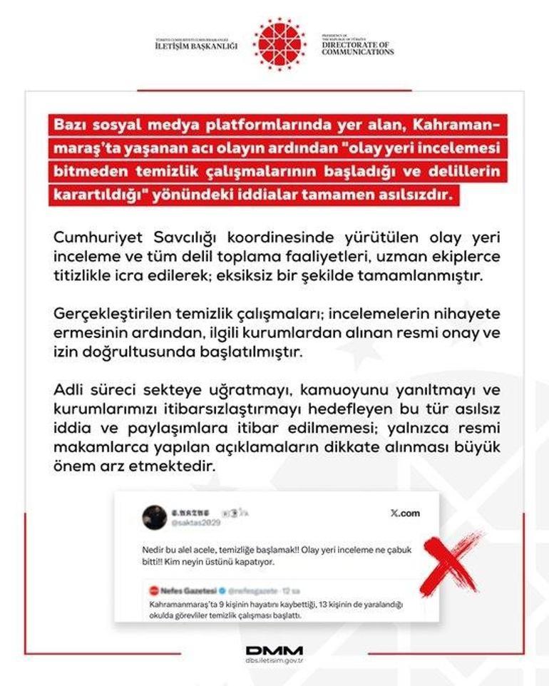 “Bazı toplumsal medya platformlarında yer alan, Kahramanmaraş’ta yaşanan acı olayın akabinde “olay yeri incelemesi bitmeden paklık çalışmalarının başladığı ve kanıtların karartıldığı” tarafındaki savlar büsbütün asılsızdır.