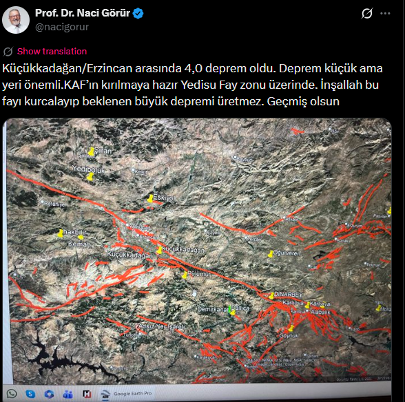 “Deprem küçük lakin yeri kıymetli. KAF’ın kırılmaya hazır Yedisu Fay zonu üzerinde. İnşallah bu fayı kurcalayıp beklenen büyük zelzelesi üretmez.”