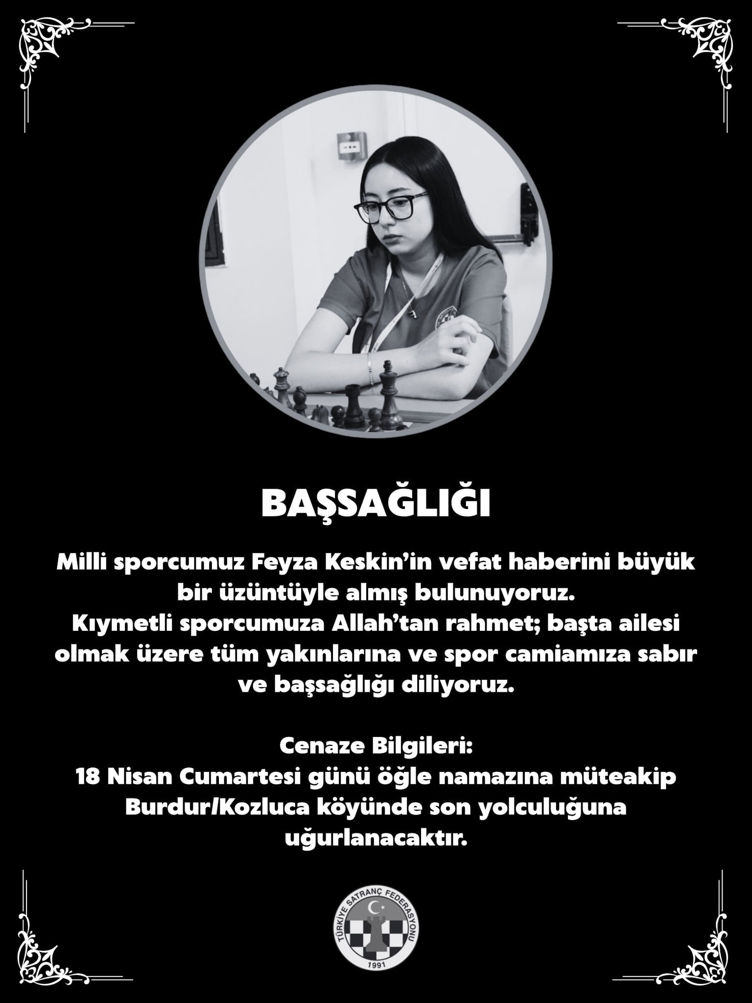 Türkiye Satranç Federasyonu, 2010 doğumlu ulusal sportmen Feyza Keskin'in hayatını kaybettiğini duyurdu. Genç atletin kesin mevt nedeni yapılacak otopsi incelemesinin akabinde belirli olacak.