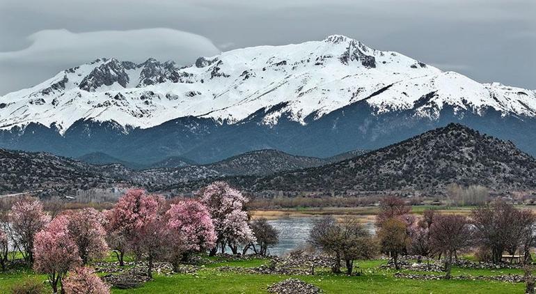 Beyşehir Gölü’nün adalarında yeşil çayırlar kendini gösterirken, çiçek açan ağaçlar ile tepelerdeki kar örtüsünün oluşturduğu görüntü, bölgeye başka bir hoşluk kazandırıyor.