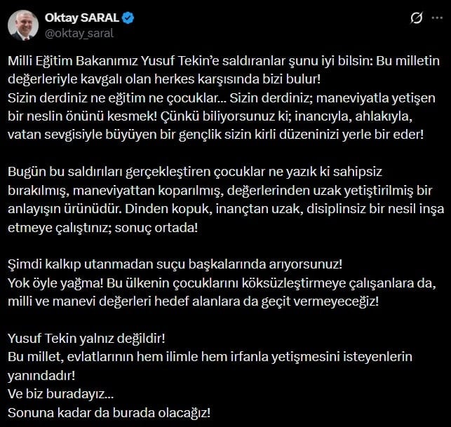Bakan Tekin’e yönelik yükselen tenkitlere Cumhurbaşkanı Başdanışmanı Oktay Saral’dan sert bir cevap geldi. Toplumsal medya hesabı üzerinden açıklama yapan Saral, yaşanan şiddet olaylarının sorumluluğunu “dinden kopuk bir gençlik inşasına” bağlayarak topu muhalefete ve eleştirenlere attı.