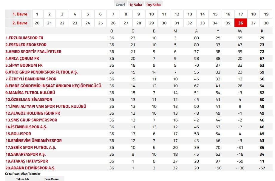 Not: Adana Demirspor’un 63 puanı silinmiştir.