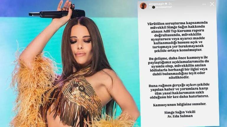 ”Yürütülen soruşturma kapsamında müvekkil Simge Sağın hakkında alınan Adli Tıp Kurumu raporu doğrultusunda, müvekkilin uyuşturucu yahut uyarıcı husus kullanmadığı hususu açık ve tartışmaya yer bırakmayacak formda ortaya konulmuştur. Bu gelişme, daha evvel kamuoyu ile paylaştığımız açıklamalarımızla da uyumlu olup, müvekkilin anılan savlarla rastgele bir ilgisi yahut dahli bulunmadığını teyit eder niteliktedir. Buna karşın gerçeğe karşıt halde yapılan haber ve yorumlara karşı tüm yasal haklarımızın gizli olduğunu bir sefer daha hatırlatırız. Kamuoyunun bilgisine sunulur”