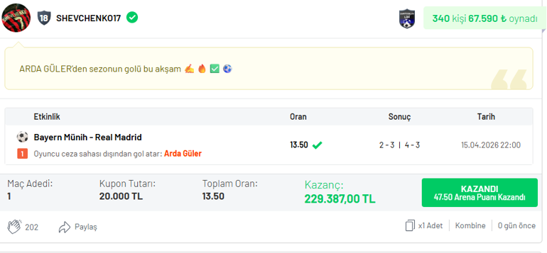 Shevchenko17, tek maçlık bir kupon yaptı. UEFA Şampiyonlar Ligi çeyrek final rövanş maçı olan Bayern Münih-Real Madrid gayreti, şimdi 35. saniyede Bayern Münih kalecisi Neuer’in yanılgılı pasında Arda Güler’in ceza alanı dışından sol ayağıyla gelişine bir vuruş sonucunda ağları havalandırmasıyla başladı. Ulusal gururumuzun 35. saniyede attığı bu gol, Real Madrid tarihindeki en erken UEFA Şampiyonlar Ligi golü olarak da tarihe geçti. Arda durmadı ve daha sonra da 29. dakikada bu sefer frikikten mükemmel bir vuruşla Allianz Arena’da ekibini tekrar öne geçiren golü attı. Lakin Arda’nın bu olağanüstü performansı kâfi olmadı ve Bayern Münih iki maçın toplamında 6-4’lük skorla yarı finale yükselen taraf oldu. Oyuncu bahis seçenekleri ortasından Arda Güler ceza alanı dışından gol atar seçeneğine oynamayı tercih eden fenomen üye Shevchenko17 ise bu varsayımıyla Arda’nın 2 tane ceza alanı dışından gol bulduğu maçın direkt başında 13.50 oran bilmiş oldu ve 229.387 TL kazandı. Fenomen üye, bu kuponuyla Misli Arena’da günün “En Güzel 20 Kuponu” ortasında yer aldı.