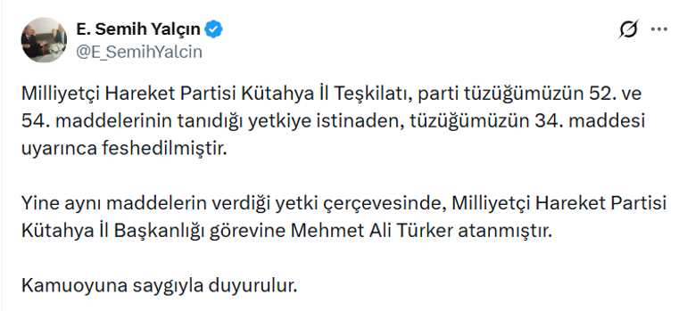 “Milliyetçi Hareket Partisi Kütahya İl Teşkilatı, parti tüzüğümüzün 52. ve 54. unsurlarının tanıdığı yetkiye istinaden, tüzüğümüzün 34. hususu uyarınca feshedilmiştir.