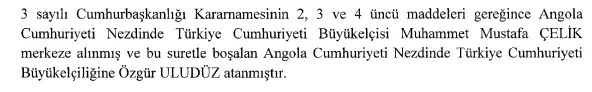 Angola Cumhuriyeti’nde ise Türkiye Cumhuriyeti Büyükelçisi Muhammet Mustafa Çelik, merkeze alındı ve büyükelçiliğe Özgür Uludüz atandı.