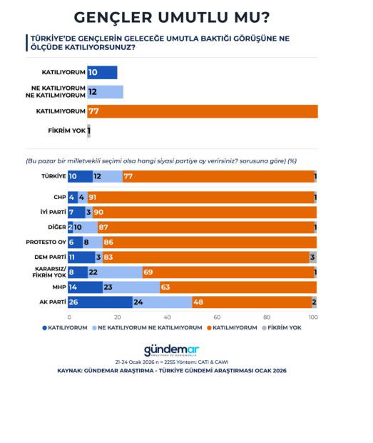 Şirketin Türkiye’deki 60 vilayette 21-24 Ocak tarihleri ortasında 2.255 bireyle yaptığı anket çalışmasında iştirakçilere, “Türkiye’de gençlerin geleceğe umutla baktığı görüşüne ne ölçüde katılıyorsunuz?” sorusu yöneltildi.