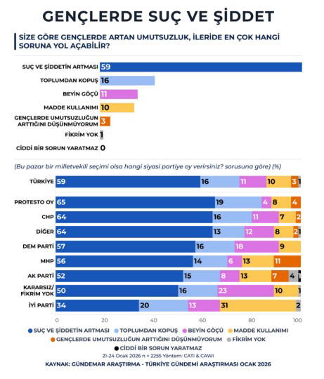 Katılımcılara, “Size nazaran gençlerde artan ümitsizlik, ileride en çok hangi meseleye yol açabilir?” sorusu da yöneltildi. İştirakçilerin yüzde 59’u, gençlerde artan ümitsizliğin en çok hata ve şiddetin artmasına yol açabileceğini tabir etti. Bunu yüzde 16 ile ‘toplumdan kopuş’, yüzde 11 ile ‘beyin göçü’ ve yüzde 10 ile husus kullanımı izledi.