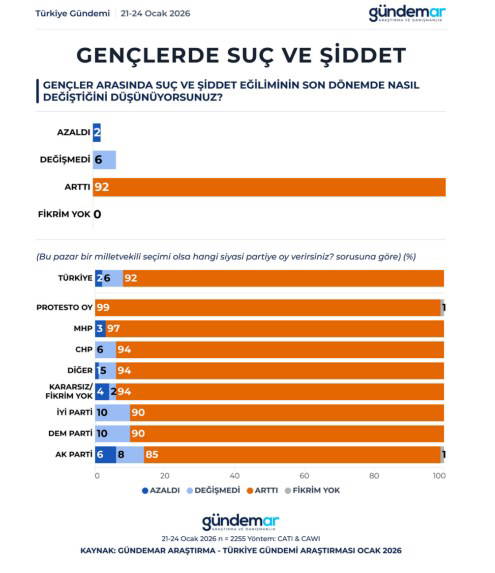 Araştırmanın en çarpıcı bulgularından biri, gençler ortasındaki kabahat ve şiddet eğilimine ait soruda ortaya çıktı. “Gençler ortasında cürüm ve şiddet eğiliminin son periyotta nasıl değiştiğini düşünüyorsunuz?” sorusuna iştirakçilerin yüzde 92’si ‘arttı’ cevabını verdi.