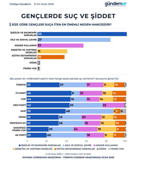 Katılımcılara, “Size nazaran gençleri suça iten en değerli neden hangisidir?” sorusu yöneltildiğinde, verilen karşılıklarda birinci sırada ekonomik nedenler yer aldı. İştirakçilerin yüzde 33’ü gençleri suça iten en değerli nedenin işsizlik ve ekonomik problemler olduğunu belirtti. Bunu yüzde 27 ile aile ve toplumsal etraf, yüzde 17 ile husus kullanımı, yüzde 11 ile kontrol ve yaptırım eksikliği ve yüzde 10 ile eğitim sistemindeki meseleler takip etti.