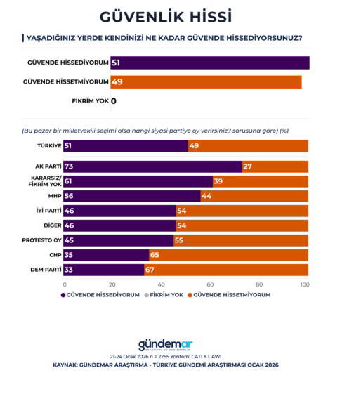 Araştırmada iştirakçilere, “Yaşadığınız yerde kendinizi ne kadar inançta hissediyorsunuz?” sorusu da yöneltildi. Sonuçlar, toplumun güvenlik hissi bakımından tam manasıyla ikiye bölündüğünü gösteriyor.