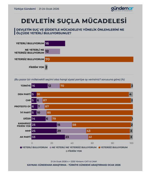 GÜNDEMAR Araştırma’nın Türkiye Gündemi Araştırması, toplumda güvenlik tasasının derinleştiğini, cürüm olaylarının arttığı istikametindeki kanaatin güçlendiğini ortaya koydu.