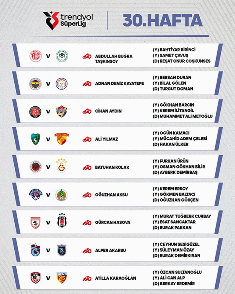 Trendyol Süper Lig'de 30. hafta hakemleri açıklandı. Gençlerbirliği - Galatasaray ve Fenerbahçe - Çaykur Rizespor maçlarının hakemleri aşikâr oldu.