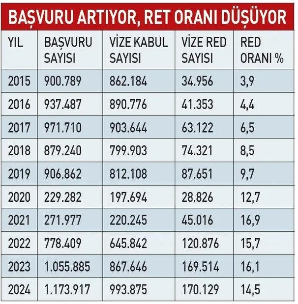 Avrupa Birliği (AB) 2024 yılına ait Schengen Vizesi istatistiklerine nazaran Schengen bölgesine en fazla vize başvurusu yapan ülke 1 milyon 779 bin 255 müracaatla Çin oldu. Türkiye 1 milyon 173 bin 917 müracaat ile ikinci sıraya otururken Hindistan 1 milyon 108 bin 239 müracaatla üçüncü sırada yer aldı. Türkiye’den 2022’de 778 bin 409, 2023’te ise 1 milyon 55 bin 885 Schengen başvurusu yapıldı. Artış eğilimi, 2024’te de güçlü biçimde devam etti. Vize müracaatlarında artış görülürken, ret oranlarında ise görece bir düşüş yaşandı. Türkiye’den yapılan müracaatların yüzde 14.5’i reddedilirken, bu oran 2022’de yüzde 15.7, 2023’te ise yüzde 16.1 olarak kayıtlara geçmişti. 2024’te Avrupa genelindeki ortalama ret oranı ise yüzde 14.8 oldu.